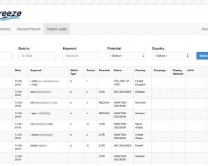 Leads, de nyckelord de använder, enhetstyp, platsinformation och information om de riktade annonserna listas.