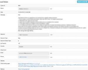 Det går att se detaljerad information om den potentiella kunden, som bland annat vilka nyckelord som använts, kontaktuppgifter och första landningssida.